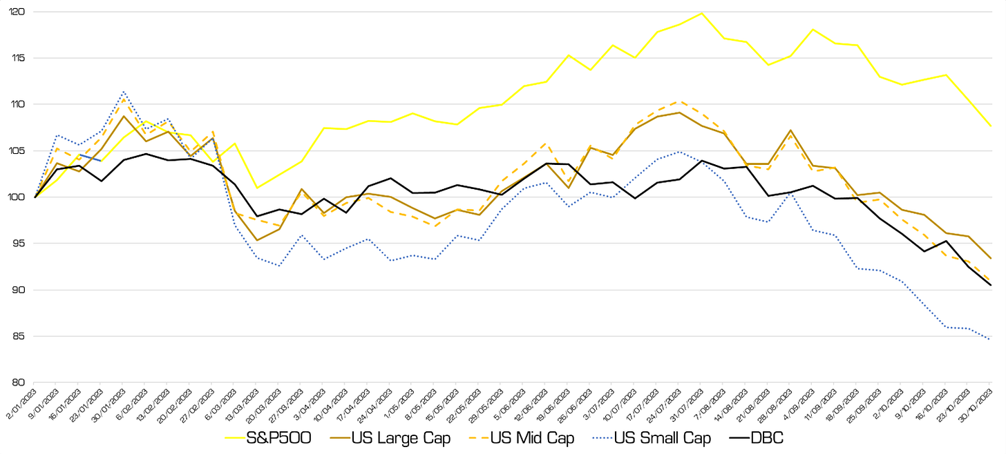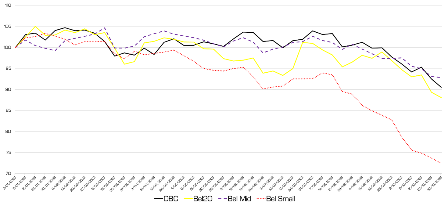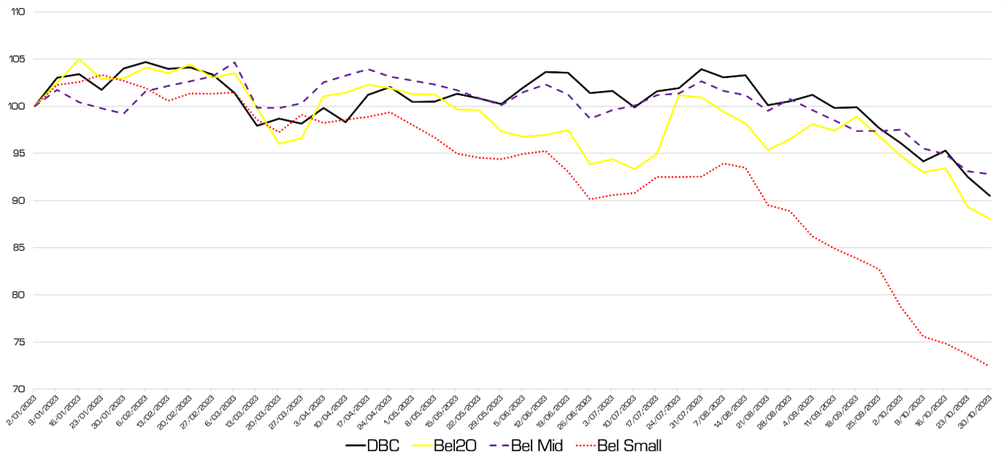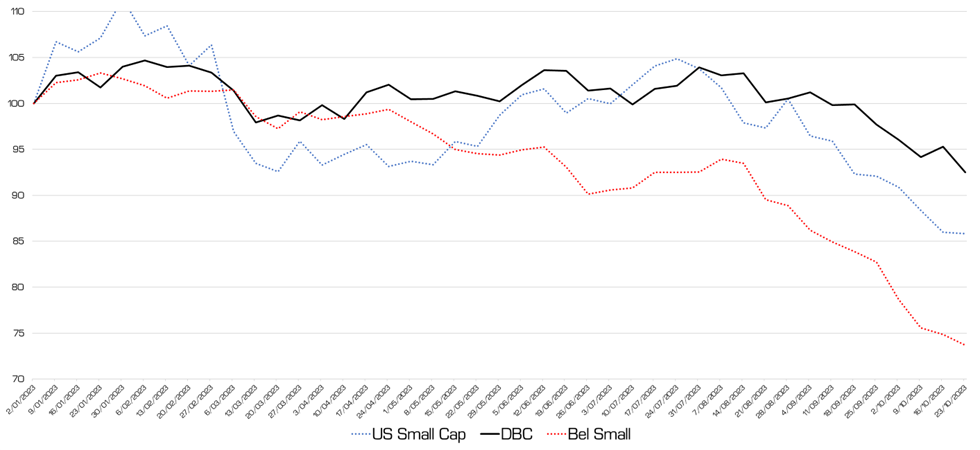Hetzelfde geldt in de Verenigde Staten. Daar is het gemiddelde kleine aandeel 15,5% gedaald sinds de start van het jaar. Amerikaanse middelgrote bedrijven verloren sinds de start van het jaar net als DBC 9,5%, terwijl grote bedrijven het verlies beperkt hielden tot 6,5%. De 500 Amerikaanse grootste bedrijven (S&P 500), daarentegen, stegen 7,5% sinds de start van het jaar, en zijn daarmee het enige kransje aandelen dat winst kan optekenen.