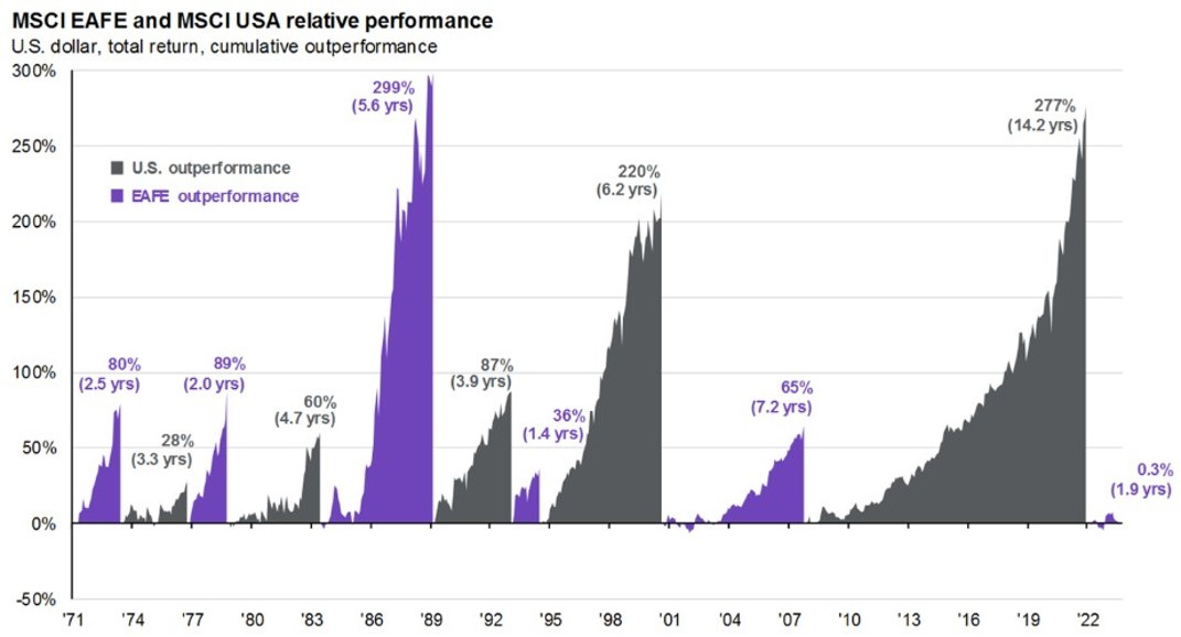 De andere component in onze focus, is de mate waarin we buiten Amerika zoeken naar interessante beleggingen. Waarom? Zijn de VS niet de best presterende aandelenmarkt?