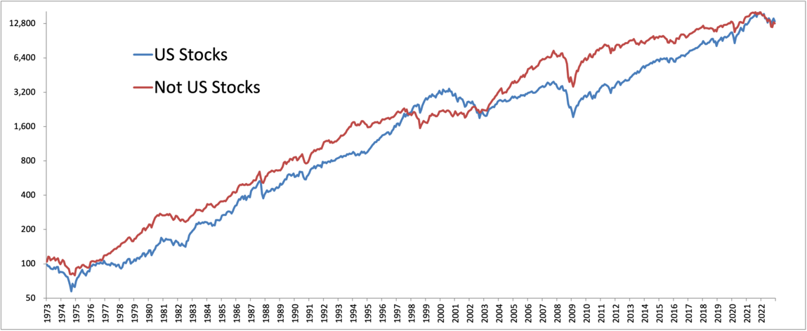Dat Amerikaanse aandelen sinds 1973 exact dezelfde return hebben opgeleverd als non-Amerikaanse aandelen.