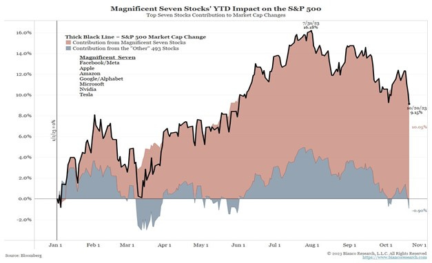 De reden achter de outperformance van deze 500 giganten is niet ver te zoeken. Ze kan volledig op het conto van de 7 allergrootste bedrijven geschreven worden. Zonder Facebook, Apple, Amazon, Google, Microsoft, Nvidia & Tesla zou de S&P 500 dit jaar op verlies staan.