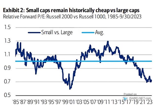 Zo ook in 2023, getuige de zwakke prestatie van kleine aandelen wereldwijd. Dat ze in 2023 zo zwak hebben gepresteerd, maakt hen ironisch genoeg alleen maar aantrekkelijker. Immers, de onderwaardering wordt gedreven door sentiment. En sentiment, dat keert vroeg of laat. Hoe groter de onderwaardering, hoe meer er te winnen valt wanneer het sentiment keert. Merk op dat het gemiddelde kleine aandeel intussen al +50% moet stijgen, om terug aan de historische gemiddelde waardering te noteren!