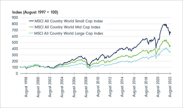 Een belegging van 100 euro gespreid over alle kleine aandelen ter wereld in 1997, zou vandaag 700 euro waard zijn. Een belegging van 100 euro gespreid over alle grote aandelen, “amper” 350 euro. En dat is na een decennium waarin Big Tech zeer sterke rendementen heeft opgetekend.